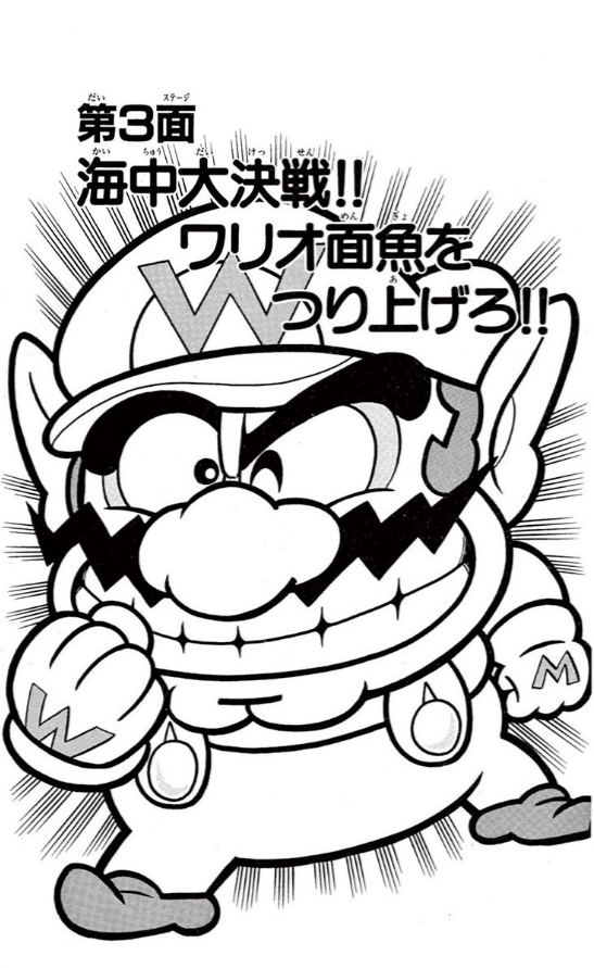 Mario, Yoshi, and Bowser-Wanda meet the Wariomengyo in Pukupuku Kai, right after defeating the Chōchin Unkō. Bowser-Wanda uses magic to protect themselves under a protective dome that the Wariomengyo just lifts and tosses away. Mario then attempts to fry him with a fireball, but he just deflects it by blowing on it. To scare off the fish, Mario uses an inflatable buffed body, but Yoshi accidentally ruins the trick. The Wariomengyo punches Mario against a ? Block. Inside, Mario finds a Star that turns him into one: believing himself to be invincible, Mario goes for the kill but gets hurt himself by slamming into the fish's face. Angry and unamused, the Wariomengyo lunges at them, but he is hooked by a fisherman and pulled out of the water. The fisherman is revealed to be Luigi, who runs away frightened.
