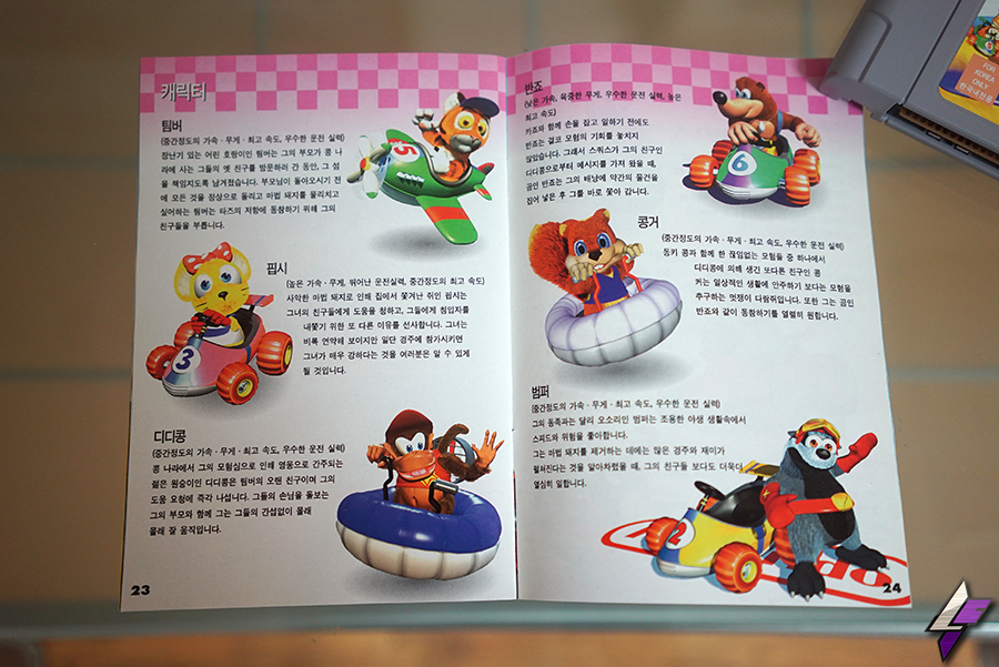 • Instruction booklet bio: "(Low acceleration, heavy weight, good handling, high top speed) Even before the start of his future partnership with Kazooie, Banjo isn’t one to turn down the chance of an adventure. So when Squawks brings the message from his pal Diddy Kong, the Honey Bear stuffs a few things into his trusty backpack and takes to his heels."[12]